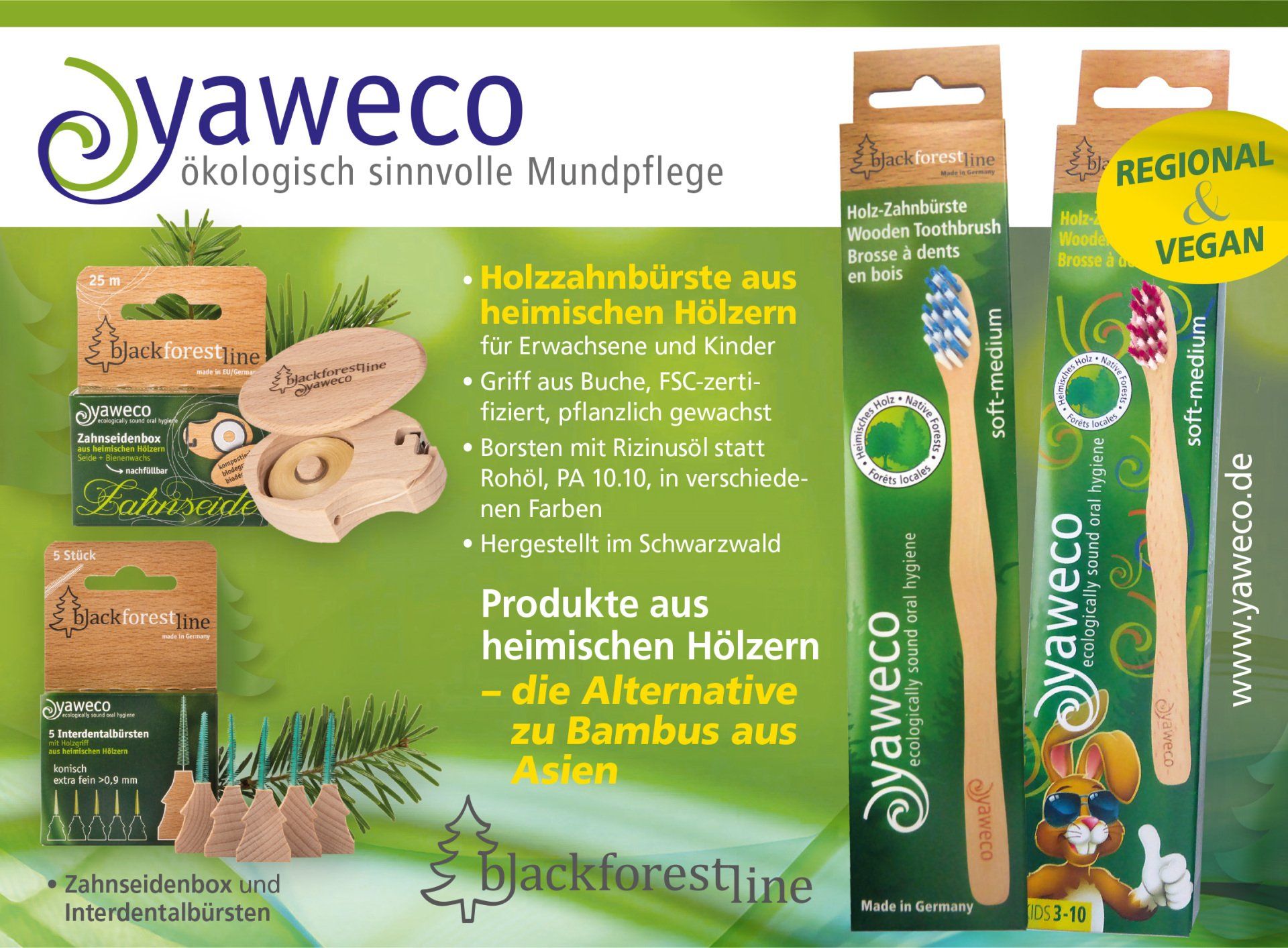 Regionalität ist für uns ein Punkt der Nachhaltigkeit. Alle Produkte, ausser die Zahnseiden, werden im Schwarzwald hergestellt. Die Zahnseiden werden in Italien gefertigt.